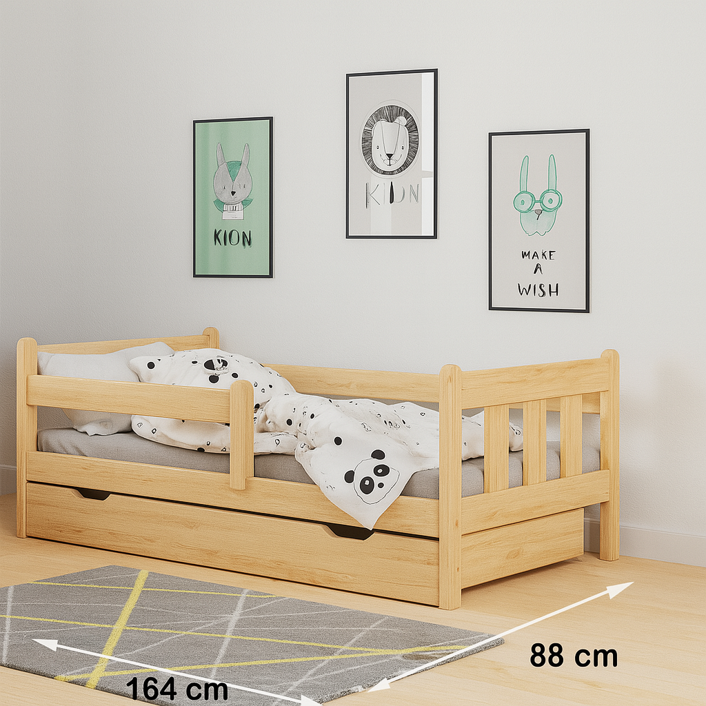 Pat practic și sigur pentru copii, realizat din lemn de pin natural, cu margini anticădere și sertar de depozitare. Dimensiuni: 164x88x60 cm. Salteaua nu este inclusă.