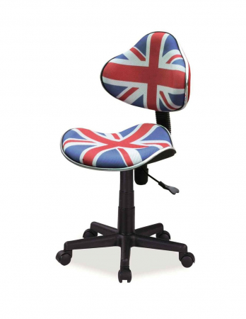 Tapițeria din material mesh asigură o aerisire optimă, menținând confortul pe durata utilizării, în timp ce imprimeul Union Jack conferă un aspect dinamic și modern. Spătarul și șezutul sunt concepute ergonomic pentru a susține o postură corectă.